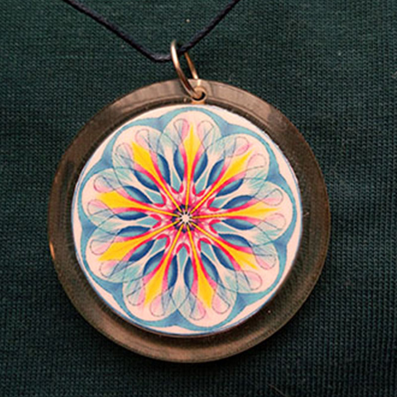 Mandala v plastovém kolečku je ve velikosti o průměru 30mm, zavěšená na šňůrce v balení na tmavomodrém kartonu v celofánovém sáčku a ze zadu vloženým přehledem další nabídky mandal. Je zde přidán i text na samostatném lístečku přibližující téma mandaly.