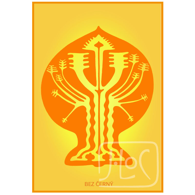 Tento obrázek je symbol stromu nakreslený v meditaci linkou, která vykreslila obrys plošného tvaru symbolu. Následné zpracování do podoby černobílé perovky bylo dále intuitivně doplněné barvou. Tisk na kartonu ve velikosti 120 x 170 mm je umístěn do celofánového obalu s popiskou vloženou k zadní straně obrázku. Od některého stromu bylo nakresleno více variant a některý strom má více barevných verzí.