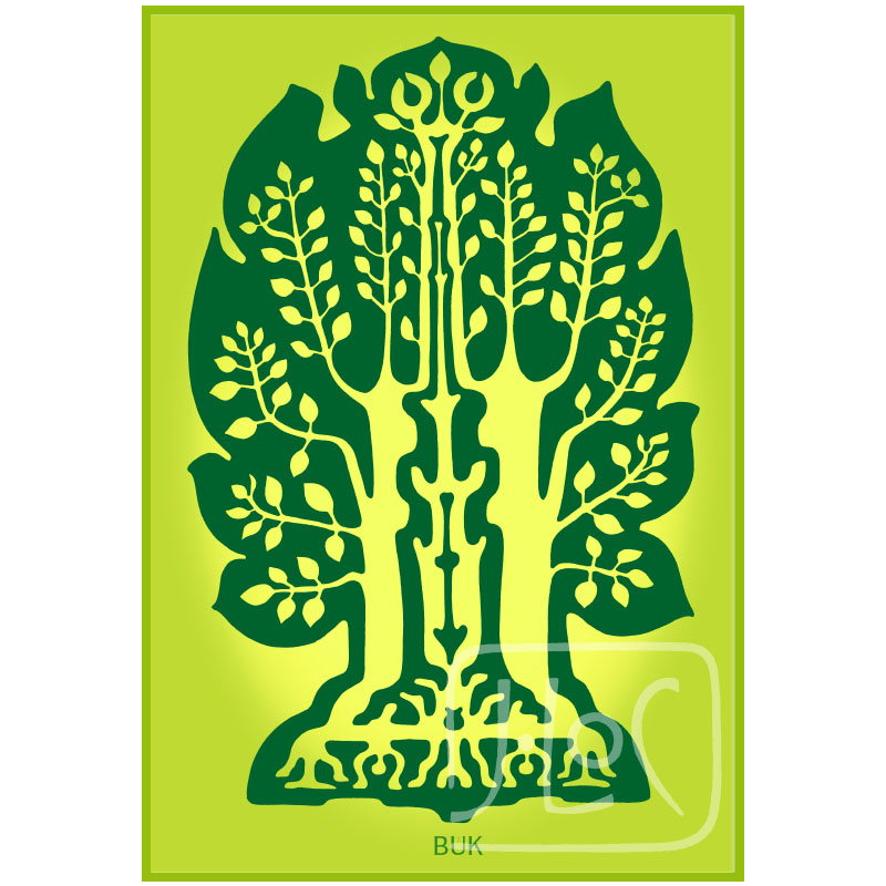 Tento obrázek je symbol stromu nakreslený v meditaci linkou, která vykreslila obrys plošného tvaru symbolu. Následné zpracování do podoby černobílé perovky bylo dále intuitivně doplněné barvou. Tisk na kartonu ve velikosti 120 x 170 mm je umístěn do celofánového obalu s popiskou vloženou k zadní straně obrázku. Od některého stromu bylo nakresleno více variant a některý strom má více barevných verzí.