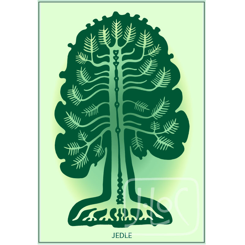 Tento obrázek je symbol stromu nakreslený v meditaci linkou, která vykreslila obrys plošného tvaru symbolu. Následné zpracování do podoby černobílé perovky bylo dále intuitivně doplněné barvou. Tisk na kartonu ve velikosti 120 x 170 mm je umístěn do celofánového obalu s popiskou vloženou k zadní straně obrázku. Od některého stromu bylo nakresleno více variant a některý strom má více barevných verzí.