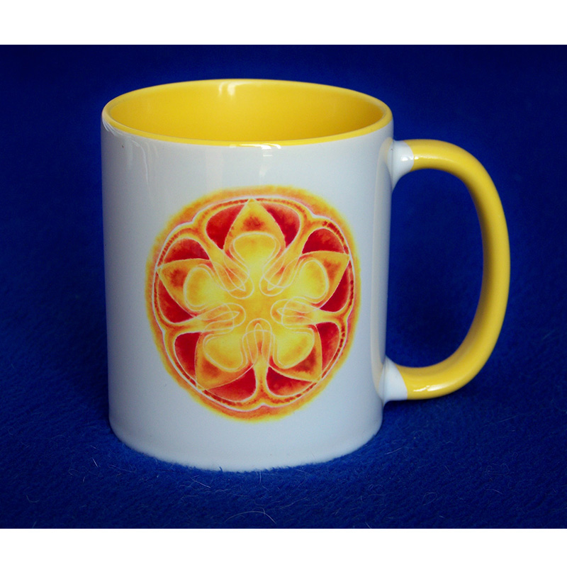 Keramický hrnek bílý s barevným vnitřkem a barevným uchem, ladící barevností s natištěnou mandalou v průměru 7 cm technikou sublimačního tisku. V krabičce s visačkou a nálepkou, kde je popis námětu mandaly a autor, výrobce.