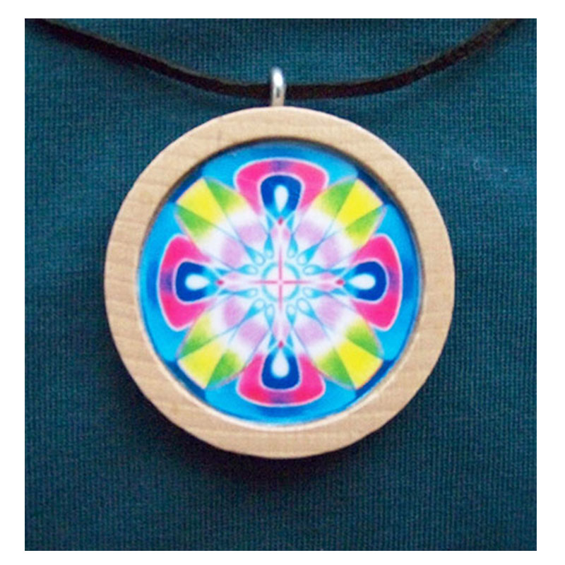 Mandala v dřevěném kolečku je ve velikosti o průměru 32mm, zavěšená na šňůrce v balení na tmavomodrém kartonu v celofánovém sáčku a ze zadu vloženým přehledem další nabídky mandal. Je zde přidán i text na samostatném lístečku přibližující téma mandaly.