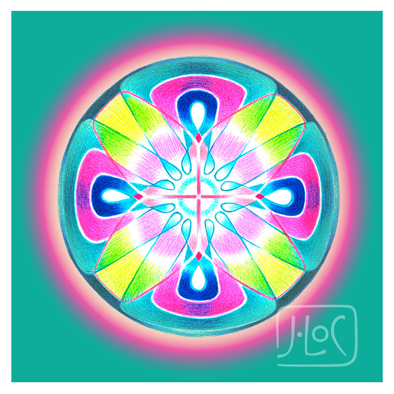 Mandala ze souboru orgánových mandal, který byl prvním souborem určeným v roce 2006 k použití na přívěsky. Nyní upravená v barevném pozadí, tištěná na karton 300g v plastovém obalu.