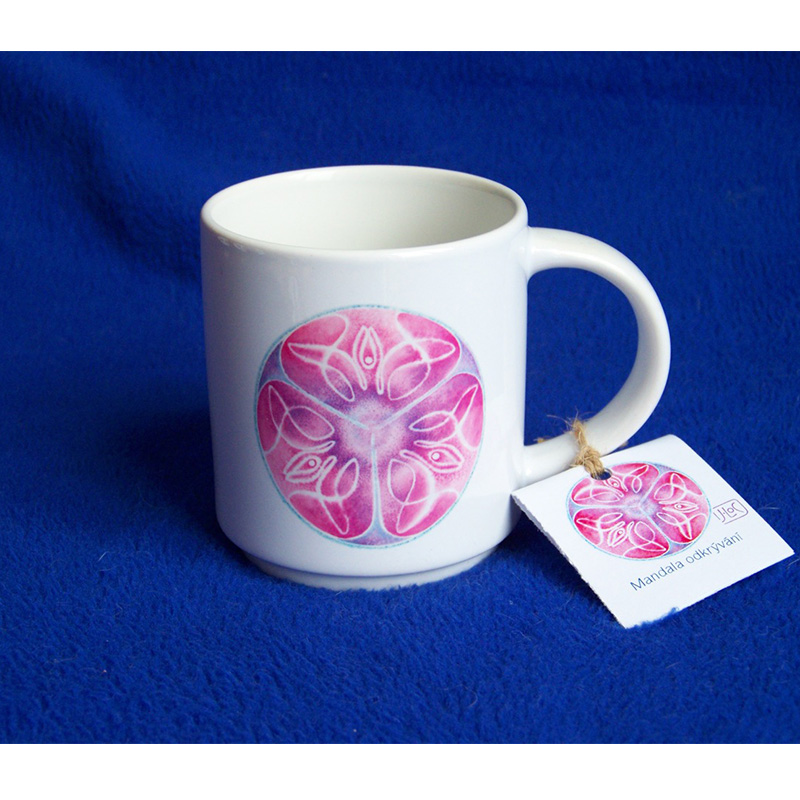 Keramický hrnek bílý malý (150ml) s natištěnou mandalou v průměru 5 cm technikou sublimačního tisku. S visačkou a nálepkou, kde je popis námětu mandaly a autor i výrobce.