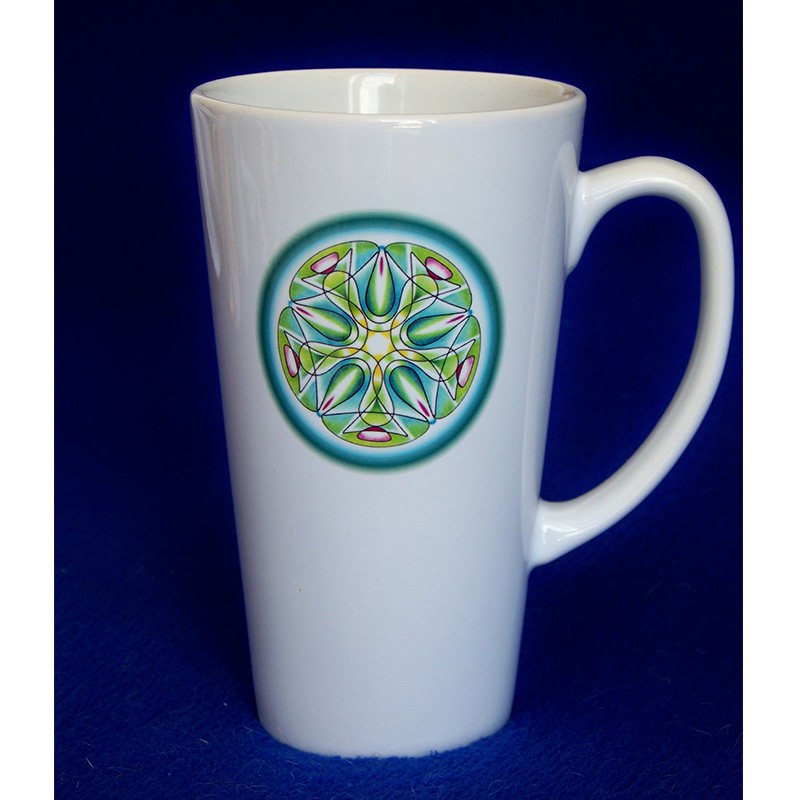 Keramický hrnek bílý malý (350ml) s natištěnou mandalou v průměru 5 cm technikou sublimačního tisku. S visačkou a nálepkou, kde je popis námětu mandaly a autor a výrobce.