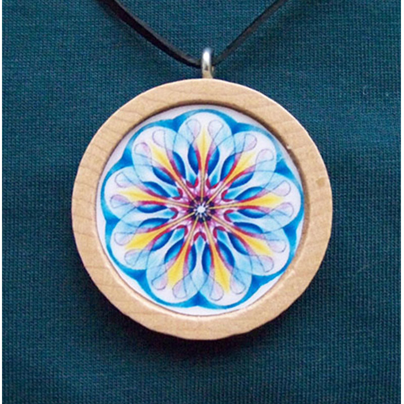 Mandala v dřevěném kolečku je ve velikosti o průměru 32mm, zavěšená na šňůrce v balení na tmavomodrém kartonu v celofánovém sáčku a ze zadu vloženým přehledem další nabídky mandal. Je zde přidán i text na samostatném lístečku přibližující téma mandaly.