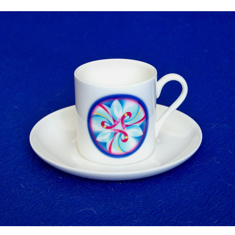 Porcelánový hrnek bílý malý (100ml) s natištěnou mandalou v průměru 5 cm technikou sublimačního tisku. K hrníčku patří talířek o průměru 13 cm. Je opatřen visačkou a nálepkou, kde je popis námětu mandaly, autor a výrobce.