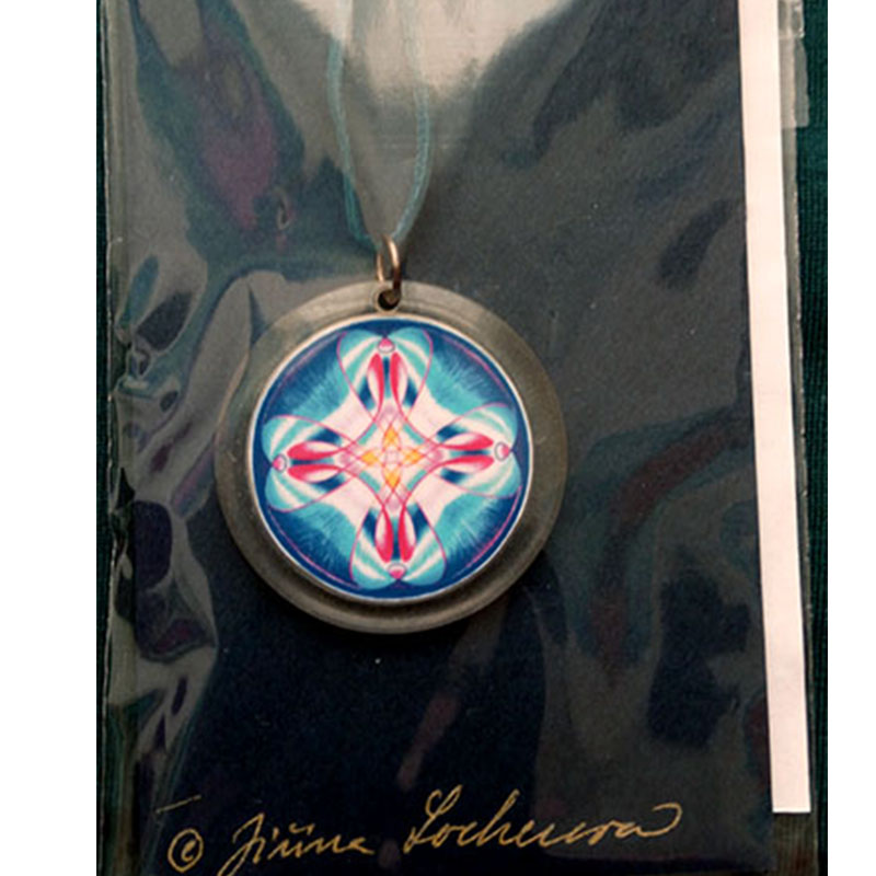 Mandala v plastovém kolečku je ve velikosti o průměru 30mm, zavěšená na šňůrce v balení na tmavomodrém kartonu v celofánovém sáčku a ze zadu vloženým přehledem další nabídky mandal. Je zde přidán i text na samostatném lístečku přibližující téma mandaly.