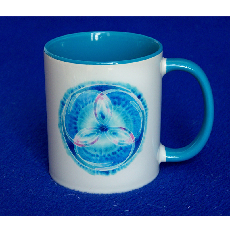 Keramický hrnek bílý s barevným vnitřkem a barevným uchem, ladící barevností s natištěnou mandalou v průměru 7 cm technikou sublimačního tisku. V krabičce s visačkou a nálepkou, kde je popis námětu mandaly a autor, výrobce.