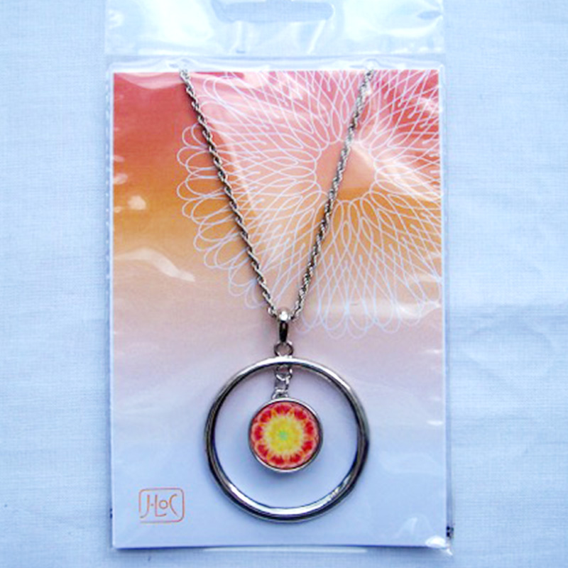 Kovový šperk: přívěsek kruhový s větším kruhem vnějším je zavěšený na řetízku. Použitá mandala v průměru 18 mm má zde název a téma: Mandala předávání.