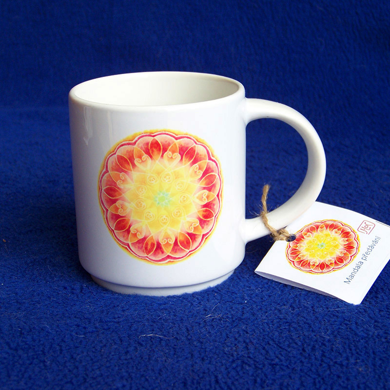 Keramický hrnek bílý malý (150ml) s natištěnou mandalou v průměru 5 cm technikou sublimačního tisku. S visačkou a nálepkou, kde je popis námětu mandaly a autor i výrobce.