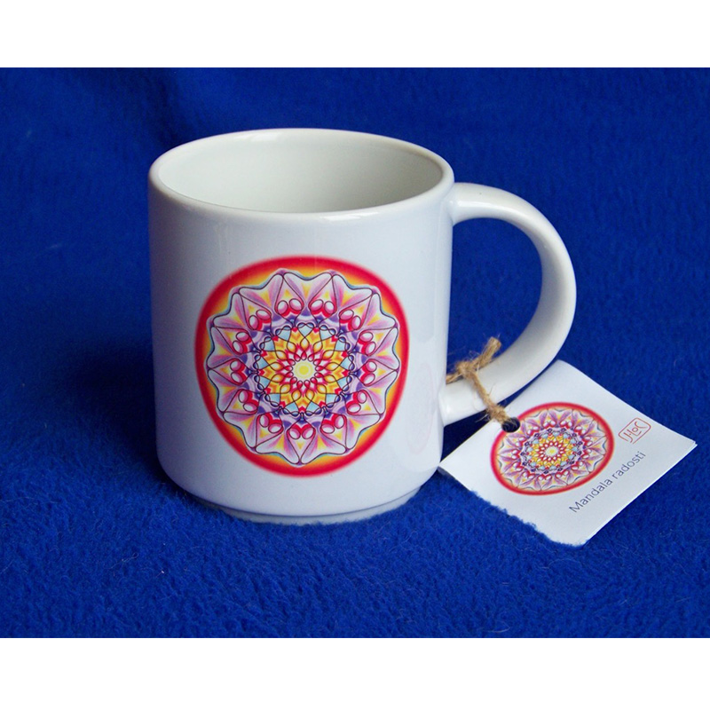 Keramický hrnek bílý malý (150ml) s natištěnou mandalou v průměru 5 cm technikou sublimačního tisku. S visačkou a nálepkou, kde je popis námětu mandaly a autor i výrobce.