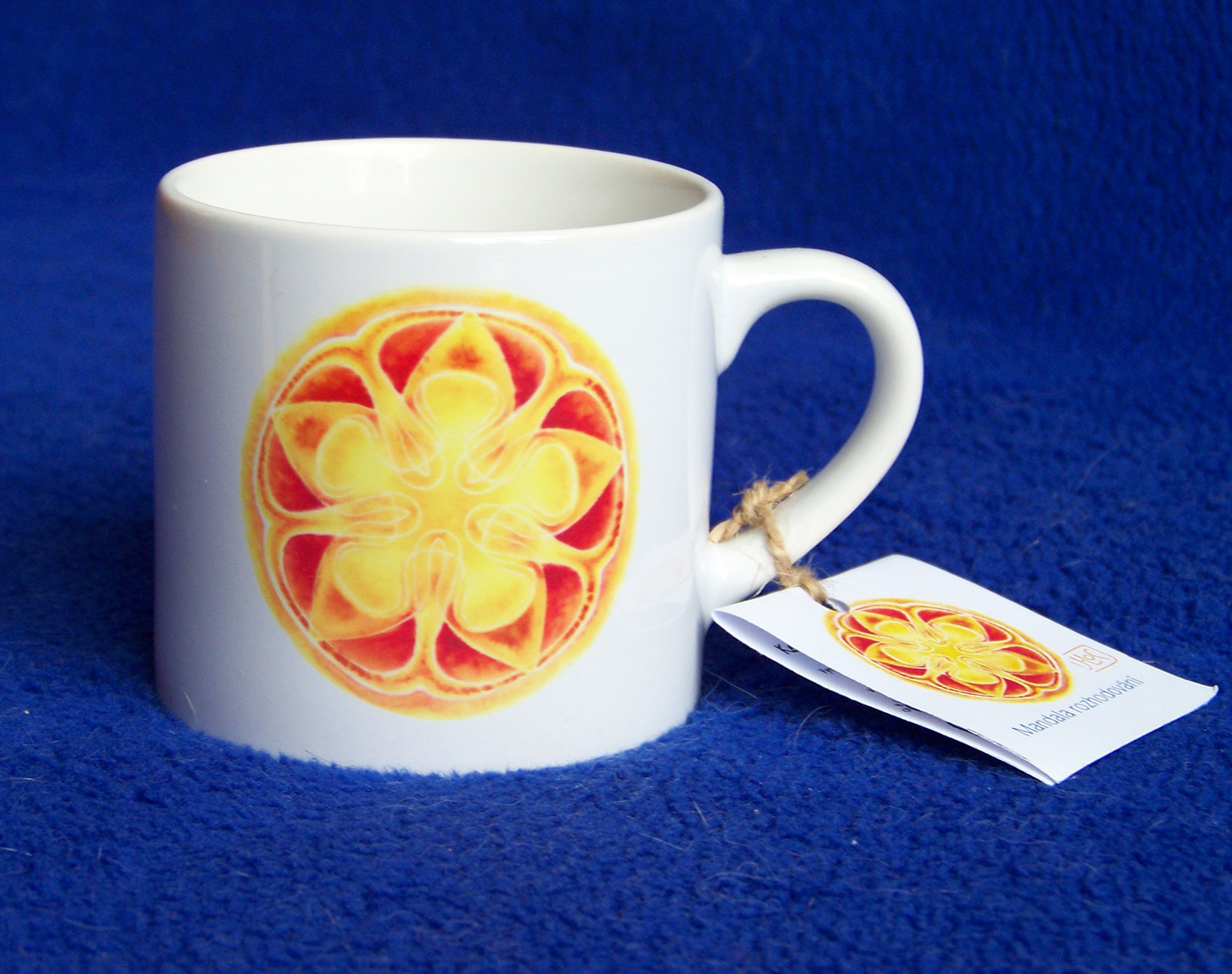 Keramický hrnek bílý malý (150ml) s natištěnou mandalou v průměru 5 cm technikou sublimačního tisku. S visačkou a nálepkou, kde je popis námětu mandaly a autor a výrobce.