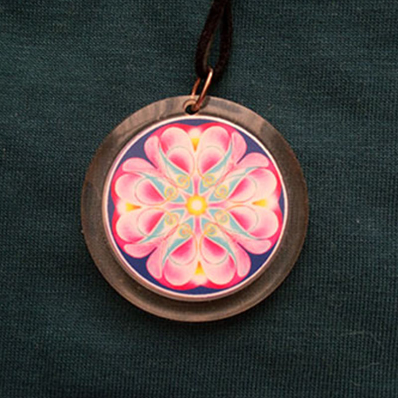 Mandala v plastovém kolečku je ve velikosti o průměru 30mm, zavěšená na šňůrce v balení na tmavomodrém kartonu v celofánovém sáčku a ze zadu vloženým přehledem další nabídky mandal. Je zde přidán i text na samostatném lístečku přibližující téma mandaly.