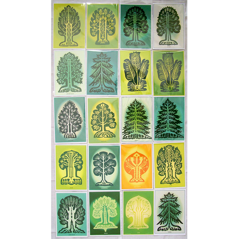 Tento celek 20-ti karet stromů, kde je 16 kreseb různých stromů a 4 odlišné barevné varianty, je možné zakoupit za cenu, kde se promítá sleva za jeden kus. Můžete objednat celý tento soubor a nebo obměnit tuto sestavu. V příštím roce budou zřejmě vytvořené nové kresby stromů a sestava bude následně o nové symboly doplněna.