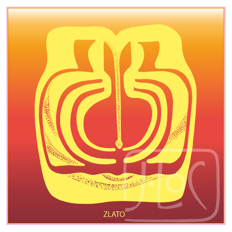 Tento obrázek je symbol kamene nakreslený v meditaci linkou, která vykreslila plošný tvar symbolu. Následné zpracování do podoby černobílé perovky je dále intuitivně doplněné barvou. Tisk na kartonu ve velikosti 135 x 135 mm je umístěn do celofánového obalu s popiskou vloženou k zadní straně obrázku. Od některého kamene bylo nakresleno více variant a některý symbol má více barevných verzí.